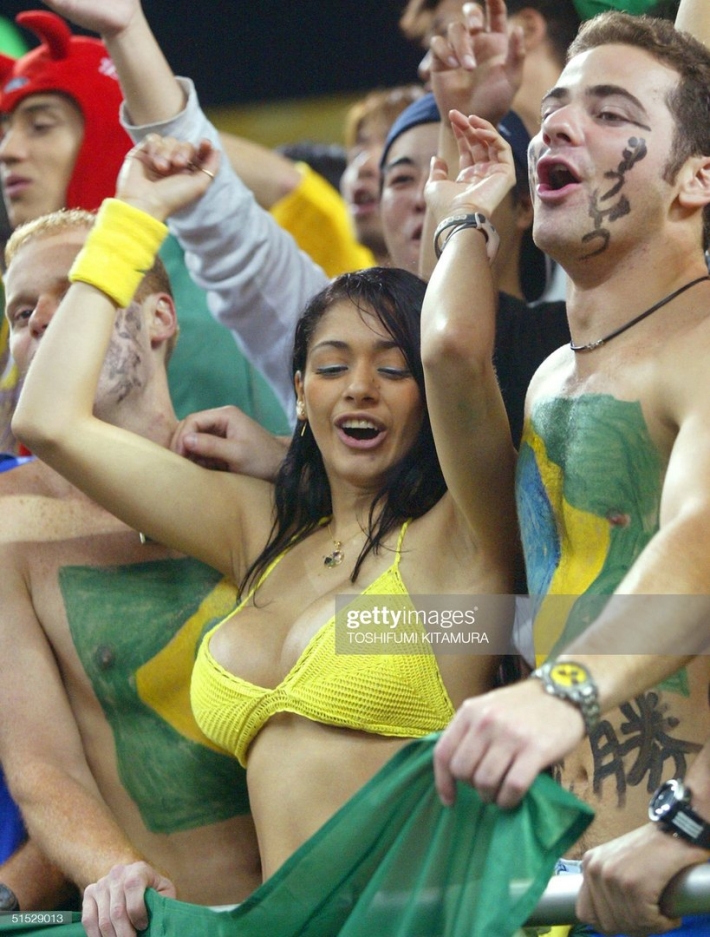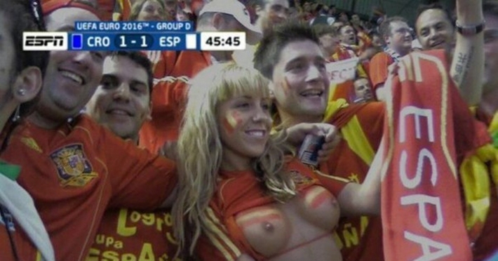 Как же сильно обрадовалась забитому голу эта сногсшибательная фанатка на трибуне, что тут же начала демонстрировать всем свой подтянутый голый бюст. Для этого обнажённой малышке было достаточно лишь задрать свою футболку, под которой не было никакого лифчика. Да, в такой ситуации рядом сидящие болельщики уже не знали куда смотреть, на поле, или на эту раздетую красавицу, которая задорно продолжила обольщать всех до того самого момента, пока её не увели под трибунное помещение.