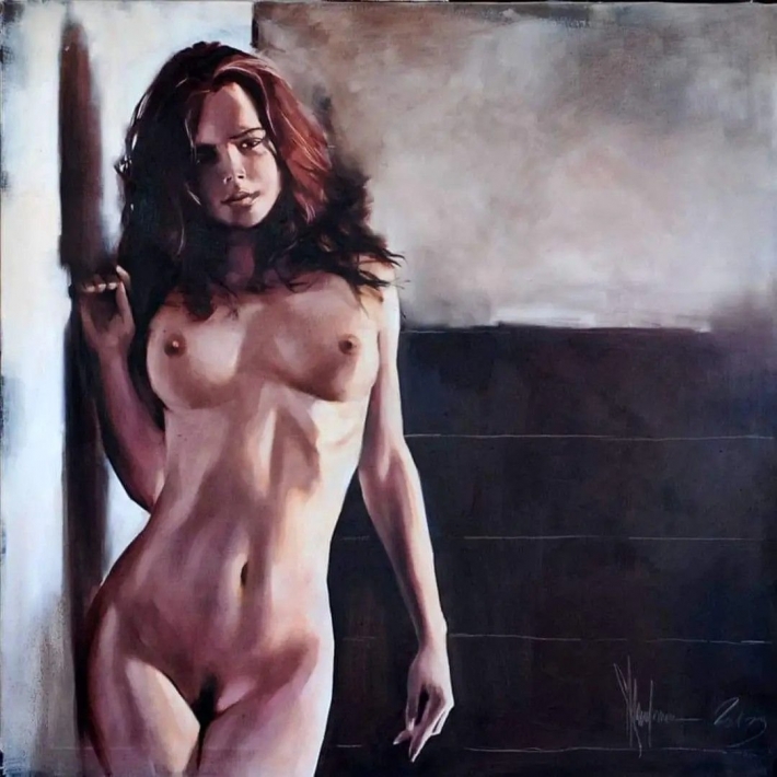 Смотреть - Обнаженная шатенка с упругой жопой у холста