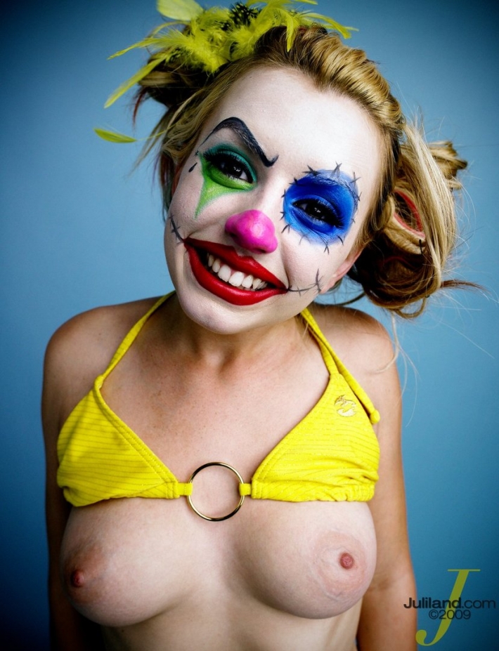 Отменно выглядят на фото соблазны обнажённой девушки клоуна, которая желает не просто порадовать своей юморостической внешностью, но и совратить раздетыми сиськами. Конечно, похотливая девушка специально вывалила наружу свои титьки, чтобы каждый желающий мог внимательно полюбоваться на голые соски, получая феноменальное блаженство. Особо позы куколка не меняет, но и без этого привлекательная девушка вызывает целую бурю положительных эмоций бесподобной эротикой.