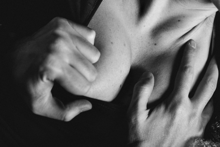Парень в татуировках жестко мнет обнаженные сиськи телочки