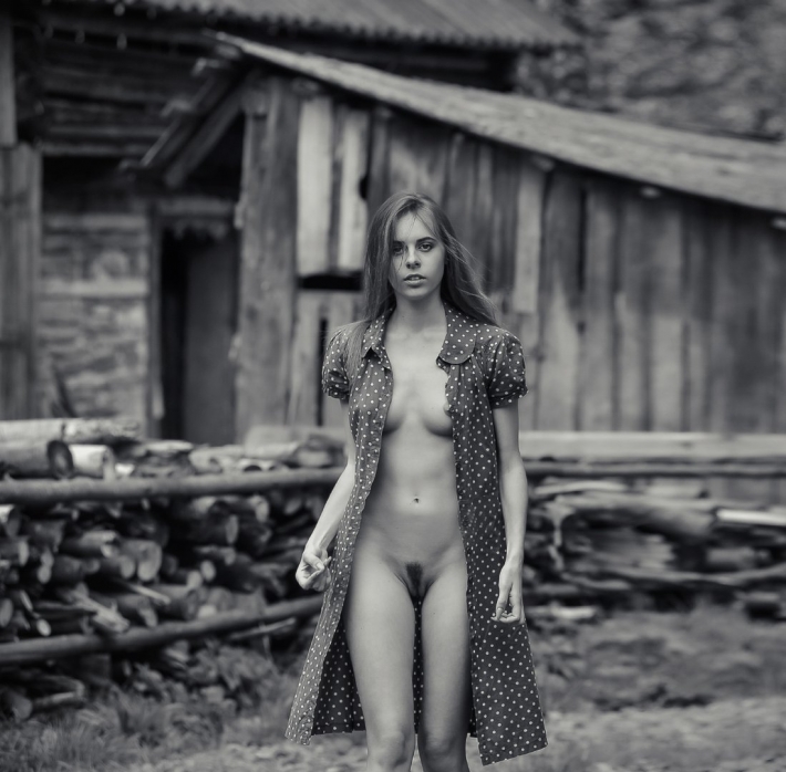 Не часто бабёнка навещает дедушку с бабушкой в деревне и бывает в их старом домике. Зато он на природе, среди деревьев и чистого воздуха. Чем еще хороши эти места, что тут внучка может сделать черно-белые фотки голышом. Она ради этого сюда и приезжает в разные поры года. Сейчас на улице осень, унылая пора и фотки будут такие же. К тому же бабёнка прогуливается с небритой киской. Она потягивается, ребра выступают на теле, а крупненькие сиси красиво выпирают на ее нежном теле. Отдых будет хороший.