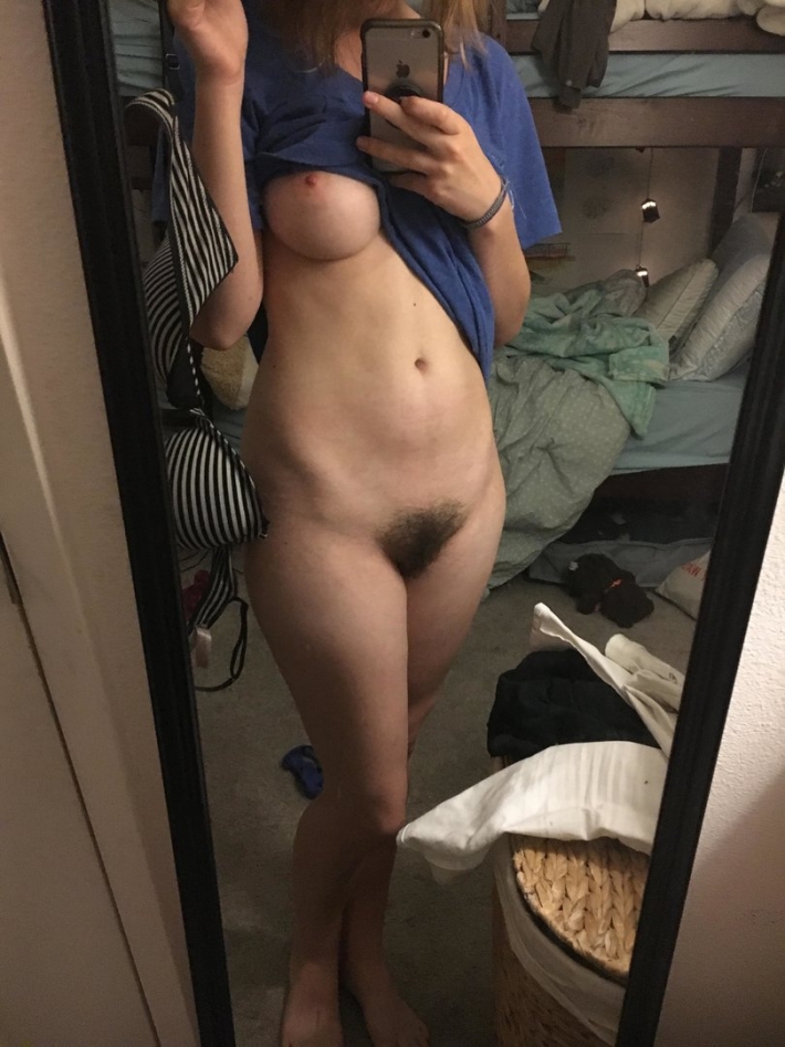 Мохнатый лобок голой девушки в примерочной (эротика)